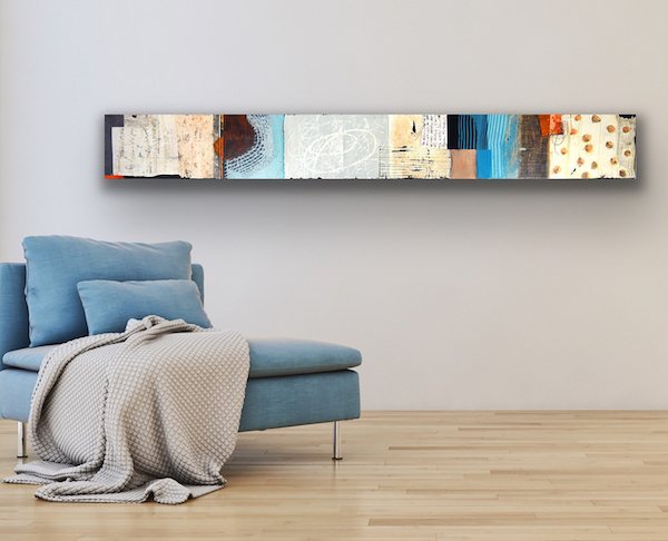 These paintings are each 6 feet long by only 9 inches wide. They create sophisticated impact in real life because of their custom 3 inch depth.